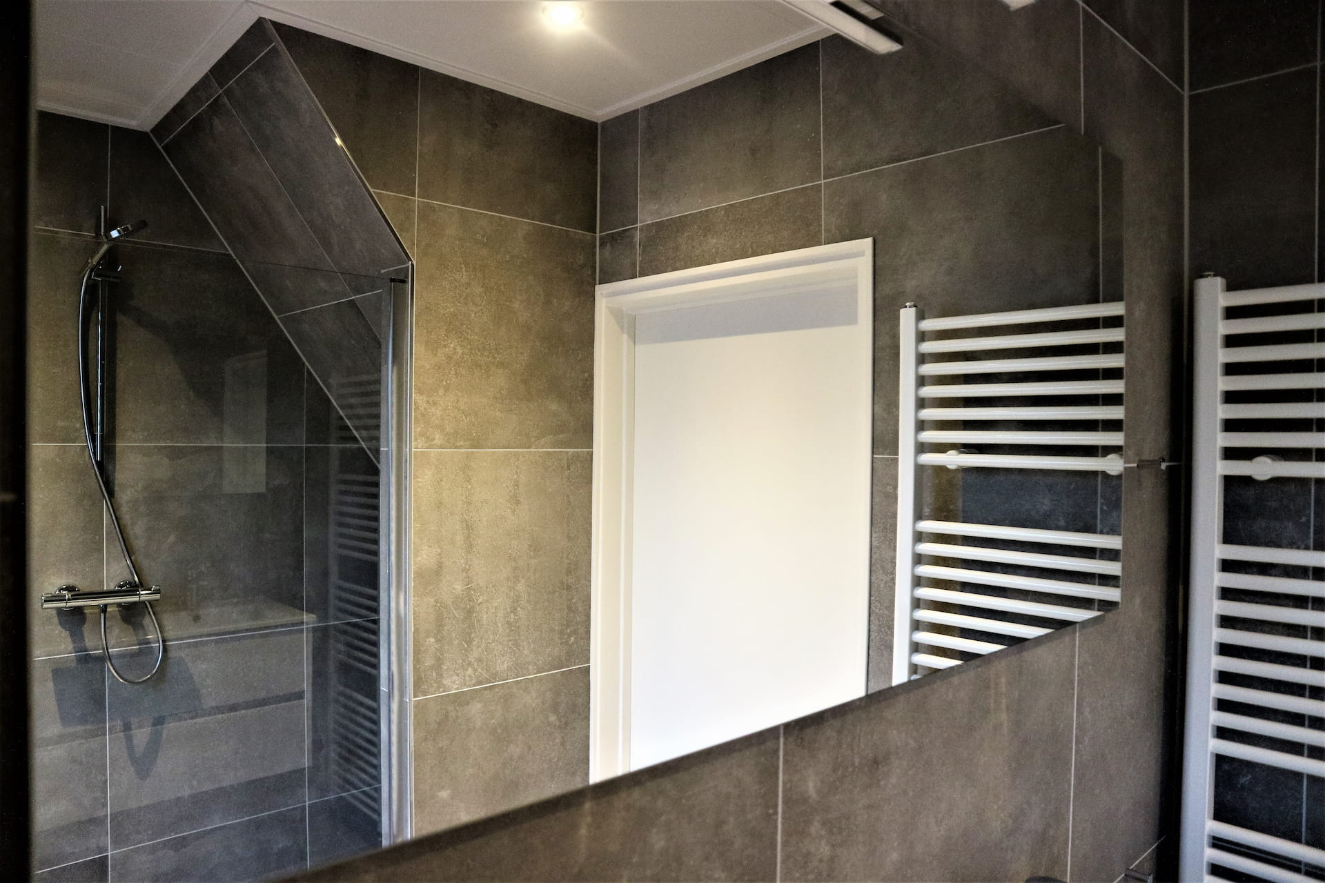 De ruime badkamer heeft een moderne uitstraling en is voorzien van een relaxdouche. Door de glazen wand blijft het lekker aangenaam tijdens het douchen.